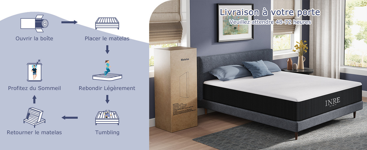Ce matelas est emballé sous vide et compressé pour faciliter son transport et son installation. Dans un espace bien ventilé, il peut retrouver sa forme initiale en 48 à 72 heures, vous offrant un confort immédiat sans les inconvénients de l’installation.