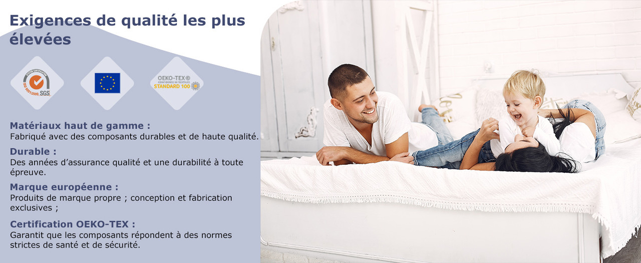 La housse de matelas est fabriquée en tissu tricoté de haute qualité, certifiée OEKO-TEX, qui est doux au toucher, respirant et assure une bonne circulation de l’air pour garder le matelas frais et sec. Elle possède également des propriétés anti-acariennes, antibactériennes, anti-moisissures et anti-allergies pour garantir un environnement de sommeil sain.