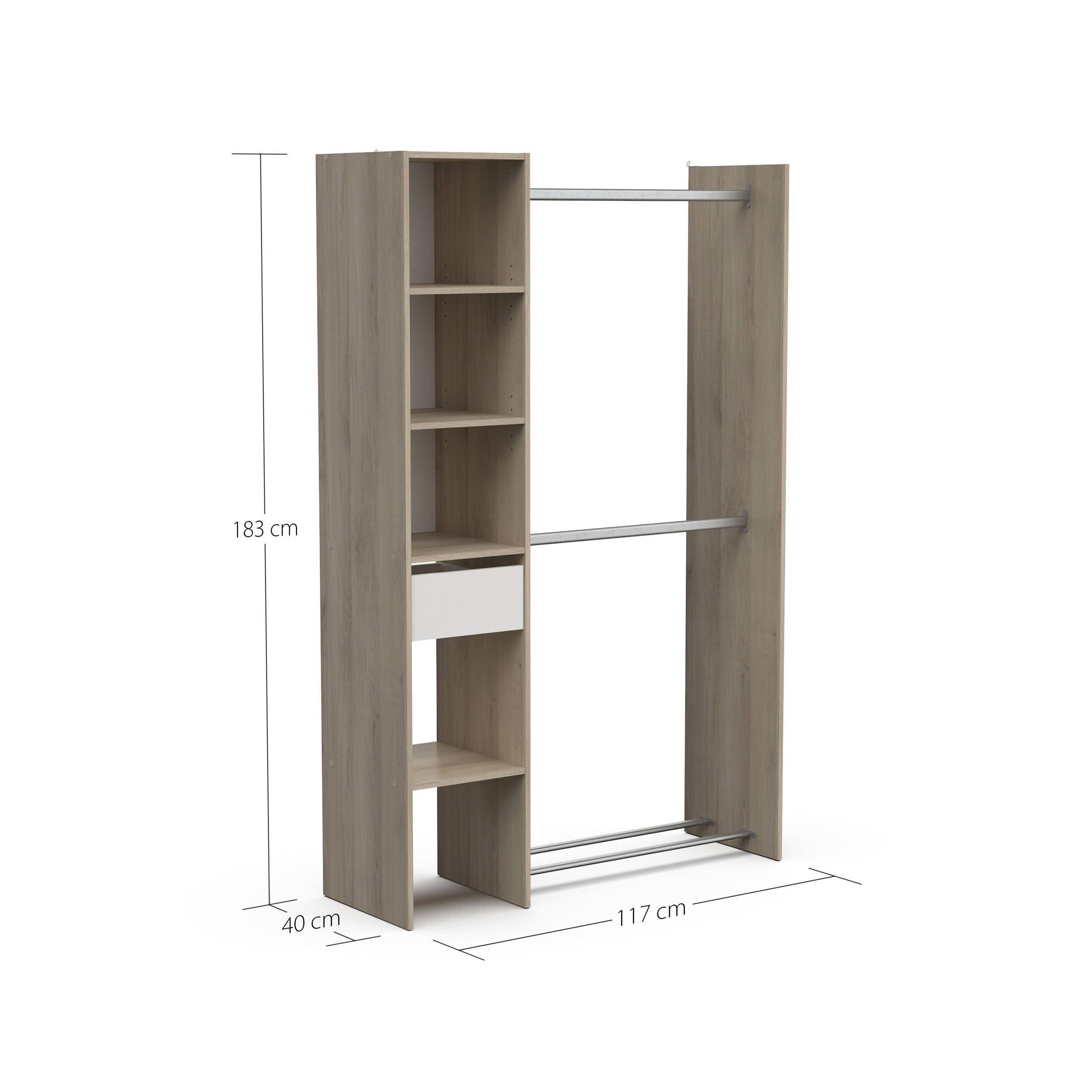 Pratique : il dispose de 2 barres de penderie, 4 étagères et 1 tiroir