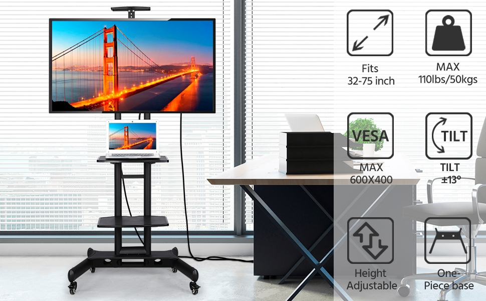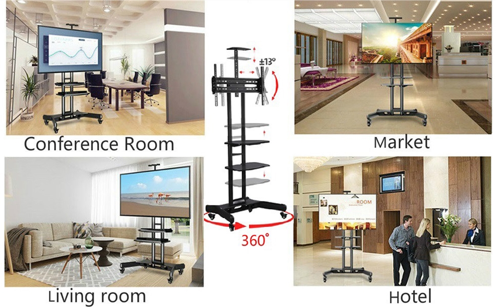Support Tv métallique mobile, hauteur réglable, pour écran plat LCD/LED 32 à 75 pouces avec roulettes verrouillables et 3 étagères. Installez un écran où vous voulez, à la hauteur qui vous convient, en l'inclinant pour plus de confort, en y associant par exemple un ordinateur portable ou une console de jeu, sans câbles qui traînent grâce aux tubes creux. Á utiliser partout, à la maison comme au bureau, dans les foires-expo, à la salle de sport, à l'hôpital.
