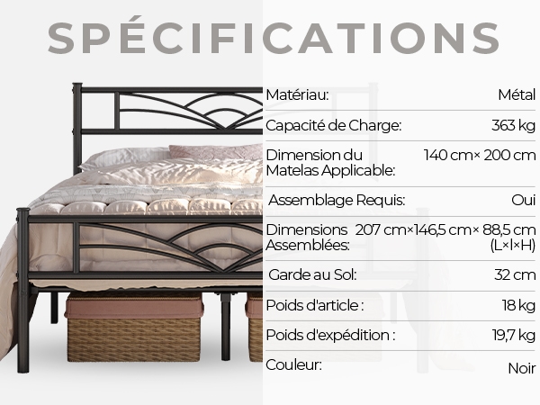 Taille de matela adaptée : 140 cm × 200 cm