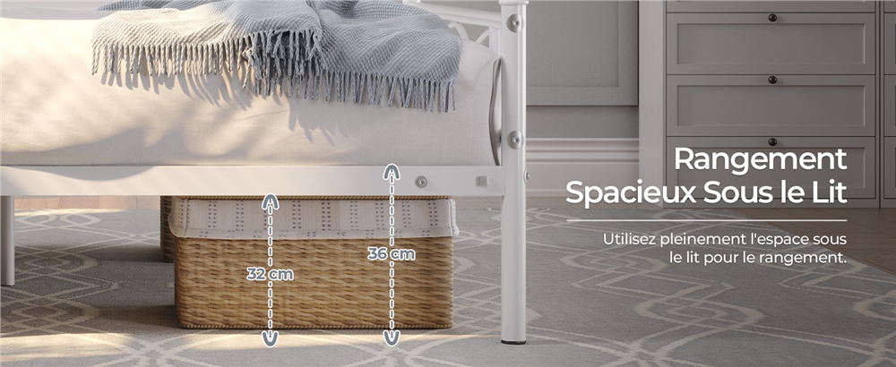 Rafraîchissez votre chambre à coucher avec cet élégant cadre de lit en métal. Minimaliste mais gracieux, ce lit en métal est défini par sa silhouette épurée et son dessin de lit inspiré des nuages, ajoutant une touche d'élégance et de fraîcheur à votre intérieur. Constitué d'une structure métallique solide, ce cadre de lit est doté de plusieurs pieds de soutien robustes qui offrent une stabilité optimale pour tout type de matelas, en mousse à mémoire de forme ou à ressorts, sans sommier, des embouts de pied antidérapants contribuent à vous offrir une nuit de sommeil sans bruit. En outre, le cadre de lit crée un espace précieux sous le lit pour ranger vos bagages, chaussures, sacs et autres bricoles, afin de garder votre chambre organisée.