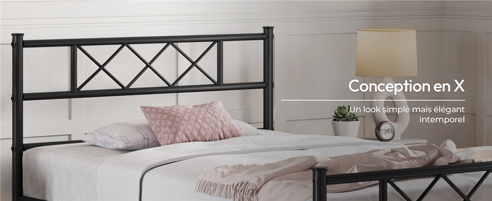 Habillez votre chambre avec ce lit design et fonctionnel. D'une armature en métal à lattes, ce modèle est conçu sans superflus, mais illuminé par les motifs croisés dans les deux bouts du lit. Un vrai cadre de lit minimaliste, idéal pour une chambre au style industriel ou moderne. Traité d'une finition mate, ce lit en métal souligne sa texture classique, muni d'un revêtement résistant à la rouille. Un modèle stable et robuste qui peut subir une charge élevée. Il conforme au matelas standard du marché. Procurez-vous ce lit simple chic et pratique.