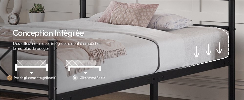 1. Cadre stable : Ce lit simple est constitué d’un cadre métallique solide et de 12 lattes métalliques robustes. Un modèle ne grince pas, pouvant subir une charge lourde.