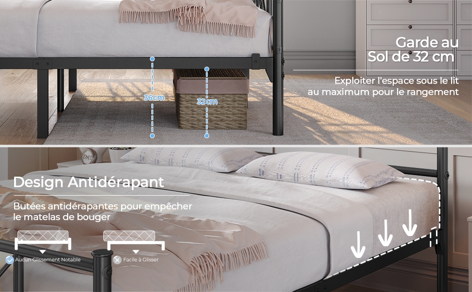 4. Volume ample sous le lit : Ce lit en métal dispose d’un espace inférieur de 32,5 cm de haut. Pour maximaliser votre pièce, vous pouvez y cacher des boîtes, des bagages, des chaussures, etc.
