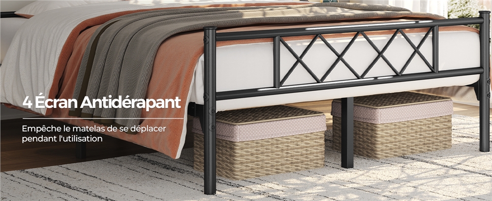 Habillez votre chambre avec ce lit design et fonctionnel. D'une armature en métal à lattes, ce modèle est conçu sans superflus, mais illuminé par les motifs croisés dans les deux bouts du lit. Un vrai cadre de lit minimaliste, idéal pour une chambre au style industriel ou moderne. Traité d'une finition mate, ce lit en métal souligne sa texture classique, muni d'un revêtement résistant à la rouille. Un modèle stable et robuste qui peut subir une charge élevée. Il conforme au matelas standard du marché. Procurez-vous ce lit simple chic et pratique.