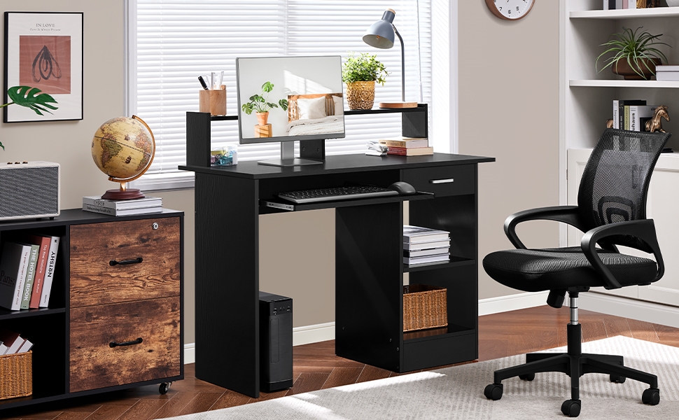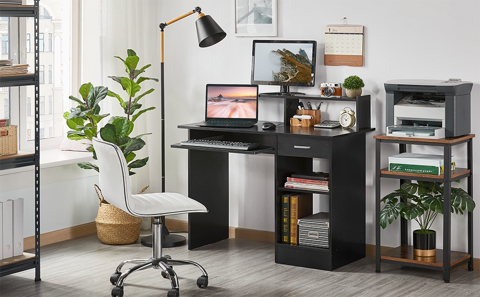 3. Grand espace de rangement: Cette table de travail possède un large espace pour satisfaire vos besoins de travail à domicile. Vous pouvez organiser des objets tels que moniteur, souris, livres, magazines, fichiers, hautparleur, etc