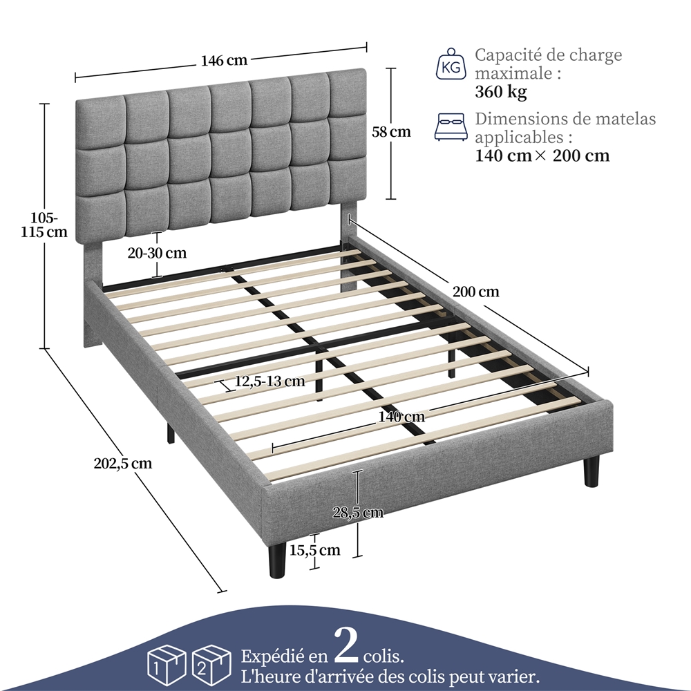 Composé d'un cadre en métal/bois solide et de tissu à l'effet lin, ce lit design est assez résistant pour supporter une charge élevée, ajoutant une touche contemporaine à votre intérieur. La tête de lit capitonné en treillis, remplie de mousse, offre un confort exceptionnel pour votre corps. Conçu ingénieuse, le cadre de lit capitonné permet de placer le matelas directement sur les lattes, éliminant ainsi le besoin d'un sommier. Vous pouvez régler la hauteur de la tête de lit selon l'épaisseur du matelas. Un modèle facile à monter, avec une notice illustrée et des pièces numérotées. Transformez votre espace de sommeil en un refuge stylé et cosy.