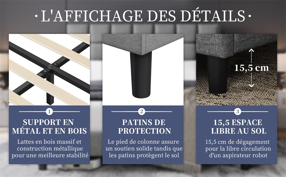 2. ✨【Facile à entretenir】Au revêtement doux et résistant, le cadre de lit capitonné vous offre un confort optimal tout en facilitant le nettoyage quotidien. Grâce à une garde au sol 15,5 cm de haut, vous pouvez laisser le robot aspirateur faire le travail à votre place.