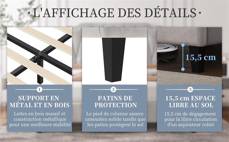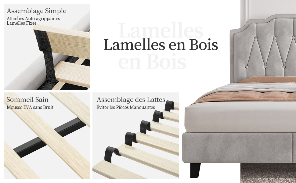 1. 【Design classique】D'un chic aspect, le cadre de lit en bois est enveloppé de tissu effet velours. Craque pour sa tête de lit capitonnée, lui donnant un charme d'élégance. Un modèle assorti aux décors variés.