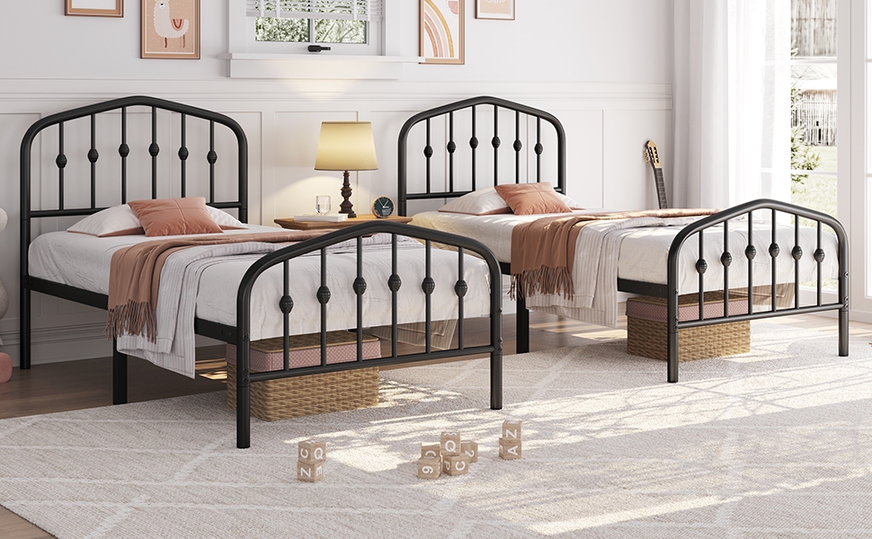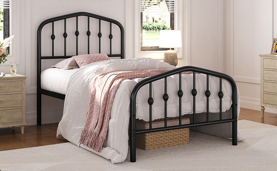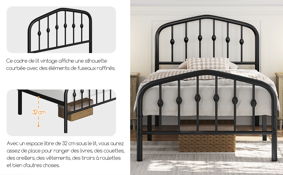 1. Construction solide: Ce cadre de lit simple est composé d'une armature métallique au revêtement poudré, avec 12 grosses lattes et 6 pieds de support. Il peut supporter un poids jusqu'à 204 kg, offrant une stabilité optimale pour un sommeil paisible