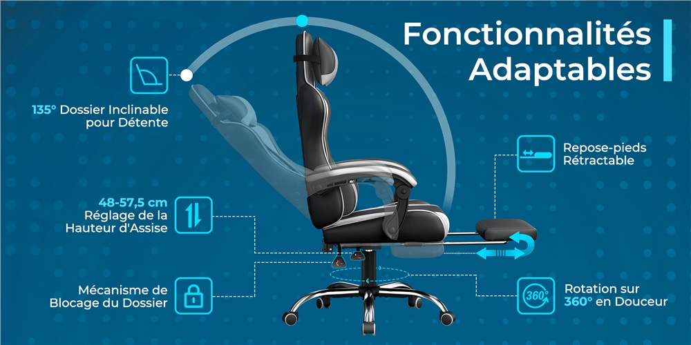 Détente complète avec repose-pieds: Adaptez la chaise de gaming à vos besoins avec un dossier inclinable jusqu'à 125°, un repose-pieds télescopique/réversible et une têtière intégrée. Que vous souhaitiez jouer, regarder des films ou faire une pause, pas de problème