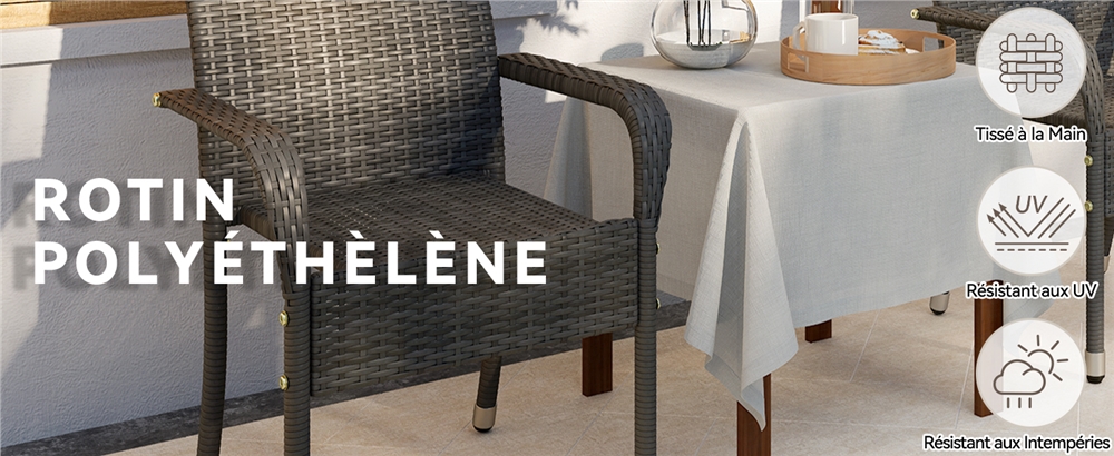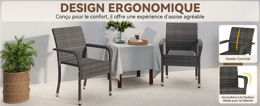 Matériaux toutes saisons : Conçus en rotin polyéthylène haute densité, ces chaises de jardin allient résistance à l'eau et aux rayons UV, même sous des conditions changeantes. Le set permet d'aménager vos espaces extérieurs sur le long terme