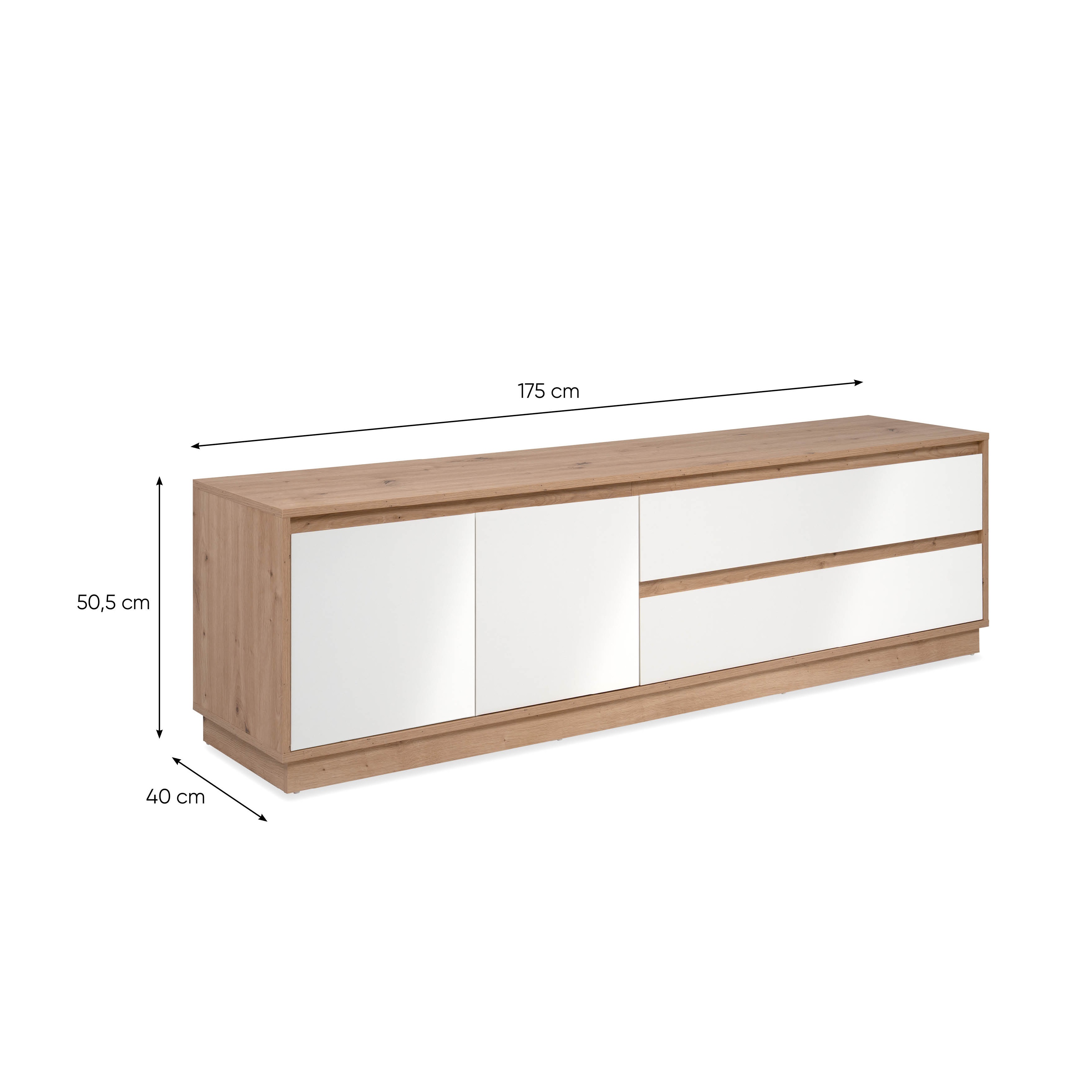 Le meuble TV 2 portes 2 tiroirs PHOENIX imitation chêne et blanc brillant séduit par son design moderne associant un décor chêne chaleureux à des façades blanches laquées brillantes.