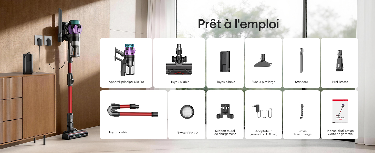 Avec une puissance d’aspiration jusqu’à 70 kPa et 3 niveaux réglables, le U18 Pro s’adapte parfaitement aux sols durs, tapis, moquettes et tissus. Poussières fines, miettes incrustées ou poils d’animaux : le nettoyage est rapide et efficace.