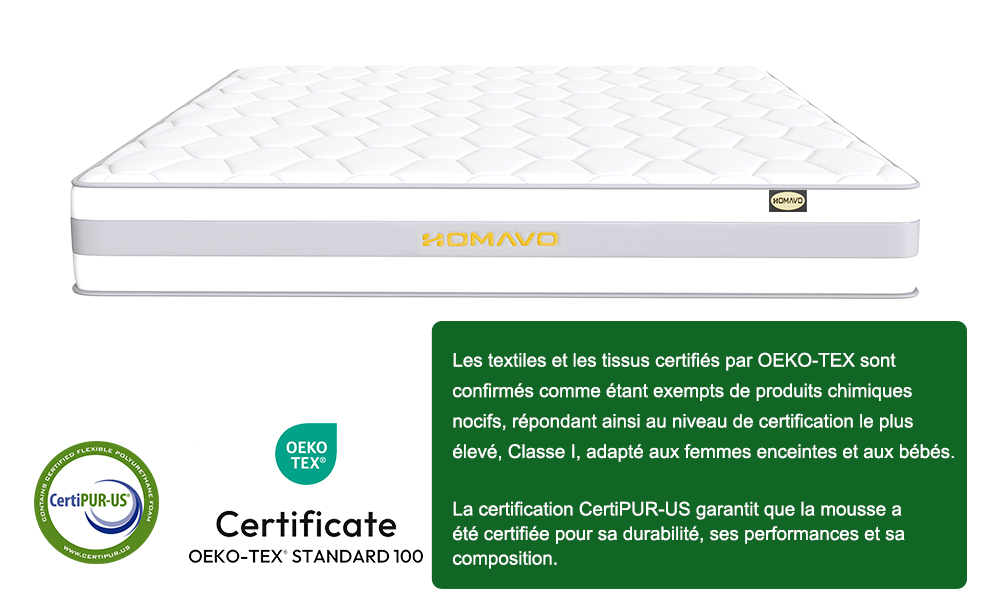 Le matelas a obtenu la certification Öko-Tex, conforme aux normes d'utilisation par les femmes enceintes et les bébés.