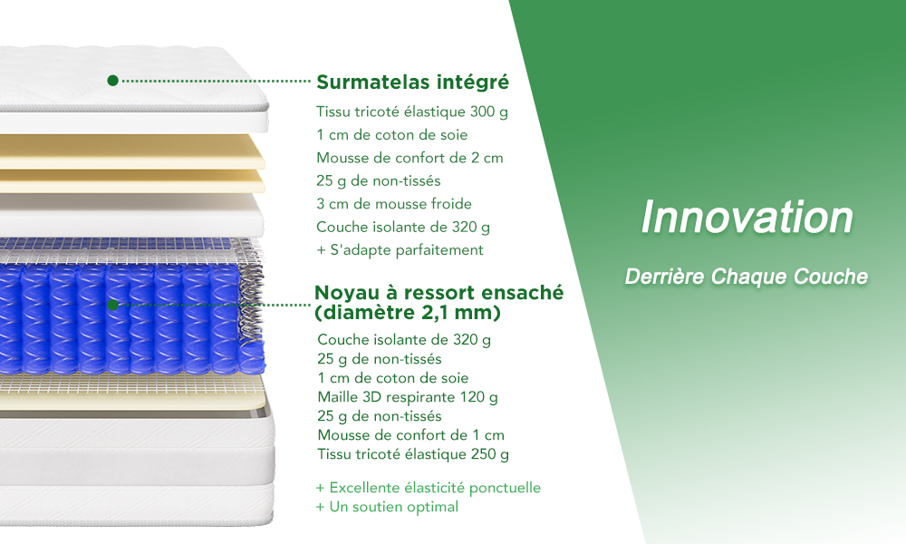 【Dix couches de matériaux de qualité – Soutien scientifique】 Le matelas combine un tissu de qualité A avec plusieurs couches de mousse haute performance (18 kg/m³ et 20 kg/m³), offrant un soutien doux. La mousse haute densité protège le noyau à ressorts, et la couche de mousse élastique soulage la pression des mouvements. La structure à ressorts ensachés indépendants réduit les vibrations et le bruit, tandis que les bords renforcés apportent un soutien supplémentaire et préviennent l’affaissement.
