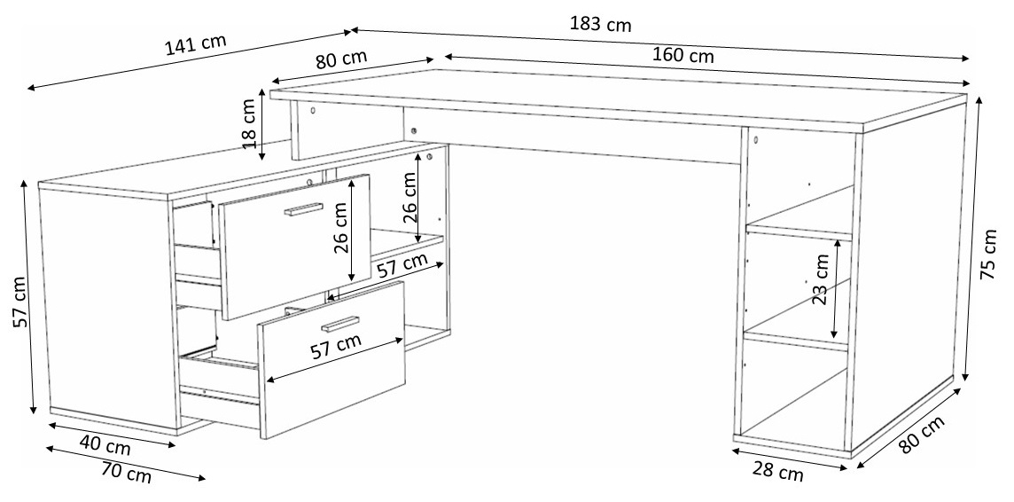 Avec ses dimensions généreuses de longueur 183 cm, largeur 141 cm et hauteur 75 cm, ce bureau offre une vaste surface de travail.