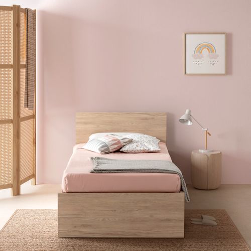Le lit coffre 90x190 cm BEST imitation chêne est idéal pour les petits espaces grâce à son ouverture frontale pratique.
